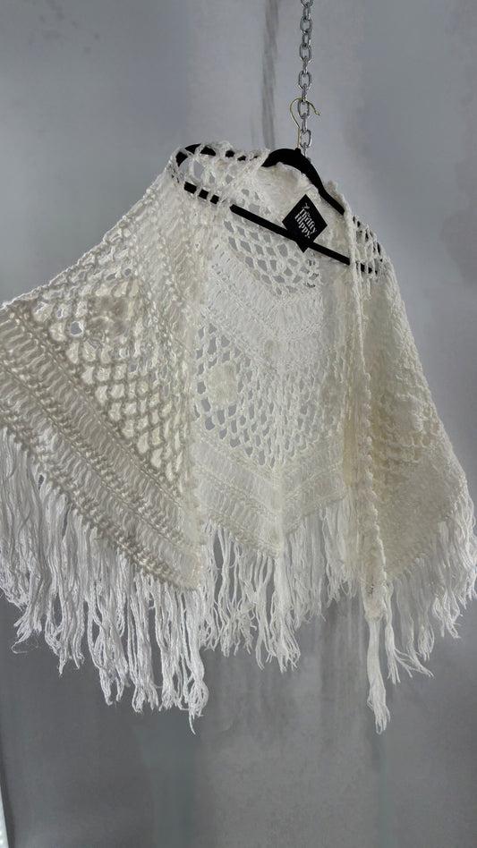 Vintage Off White Hand Knit Scarf Poncho Shawl Cape