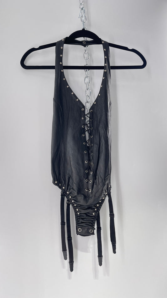 Vintage 1990s Black Leather Bodysuit with Silver Studding, Halter Neckline and Lace Up Bodice (Medium)