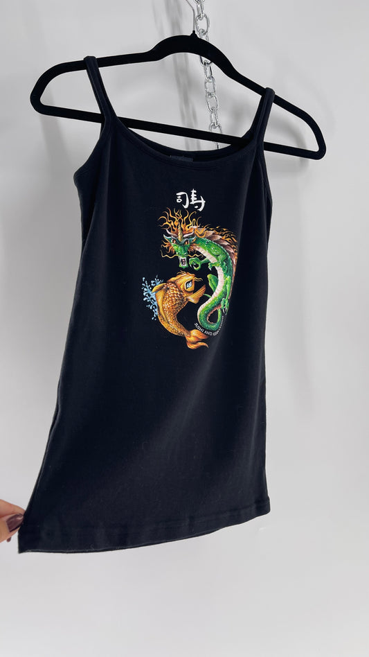 Vintage 90s The Hook Up Black Tank with Dragon and Koi Graphic (Medium)