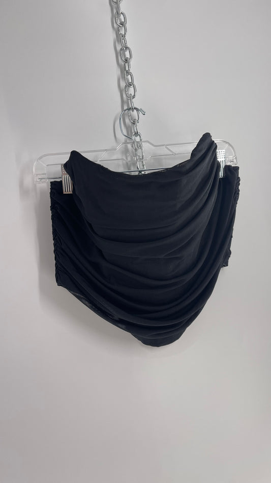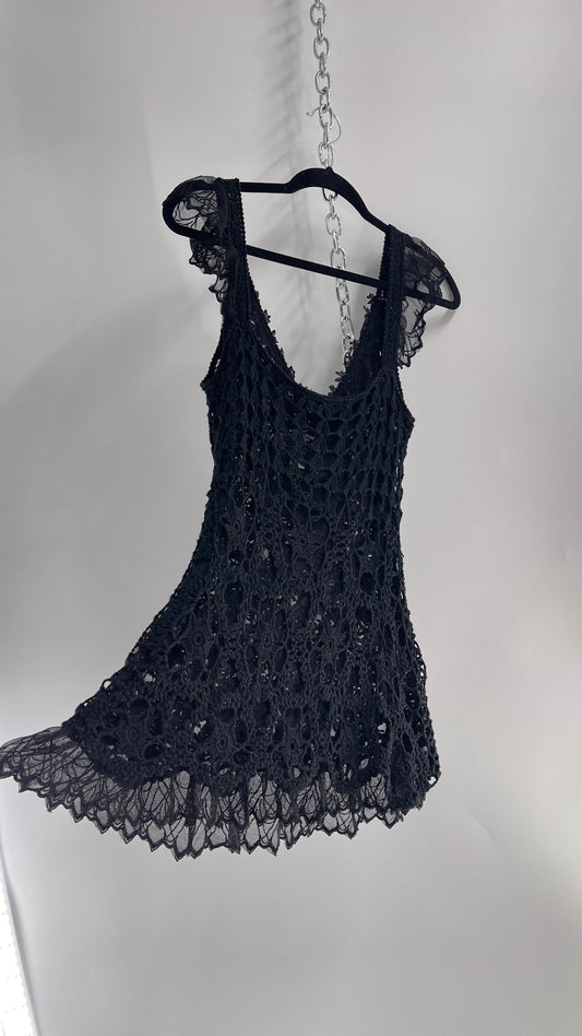 Vintage 1990s Boston Proper Black Crochet Long Tank with Lace Underlay and Ruffle Bust (Medium)