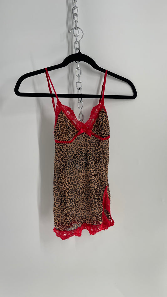 Vintage 1990s Cheetah Printed Babydoll Tank with Red Lace Trim (XS/S)