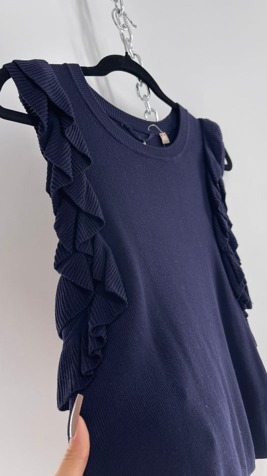 Anthropologie Knitted & Knotted Navy Ruffled Arm Sleeveless Blouse (Small)