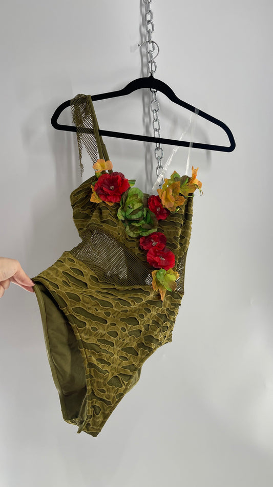 Vintage Fairy Nature Nymph Bodysuit with Flower Appliqués (S/M)