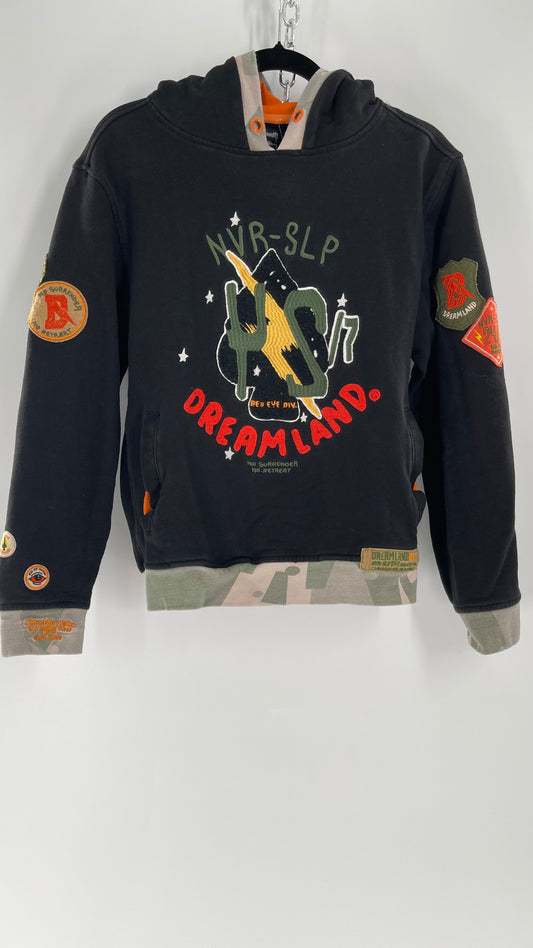 DREAMLAND Black Hoodie with Heavy Embroidered Details and Patches (Medium)