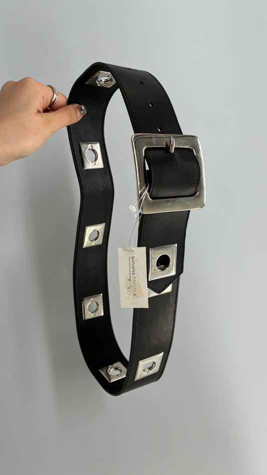 BANANA REPUBLIC Black Thick Leather Belt with Heavy Metal Details, Exaggerated Buckle, and Tags Attached (Small)