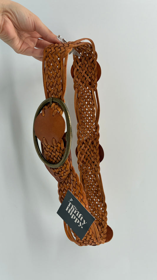 Vintage Leather Shop Belt with Bronze Buckle and Knit Details (Small)