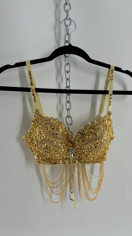 Vintage Gold Sequin Bra with Beaded Draping and Crystal Lining (34)
