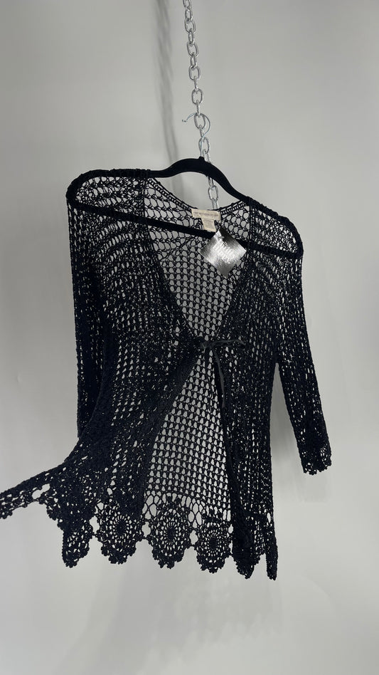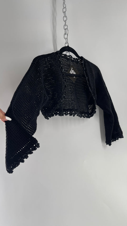 Vintage Black Hand Knit Crochet Shrug with Ribbon Detailing (Medium)