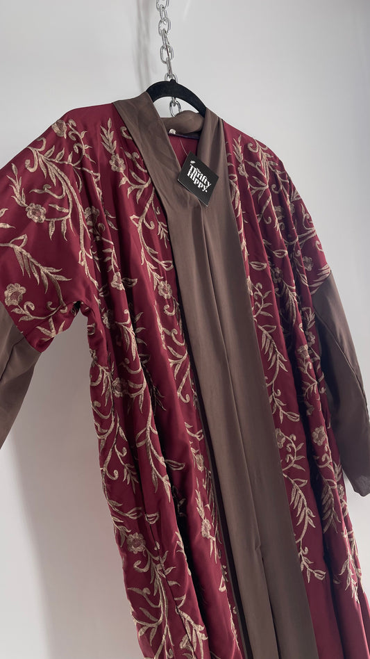 Vintage Embroidered Burgundy Sweeping Duster Coat/Cape with Tan Embroidery