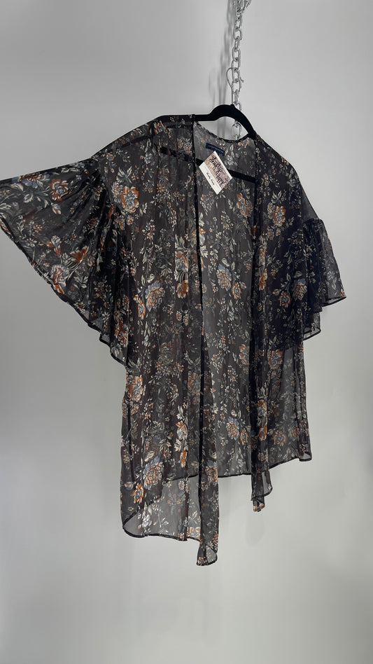 CHICO’S Poncho Black and Beige BurnOut Velour Pattern with Fringe (One Size)