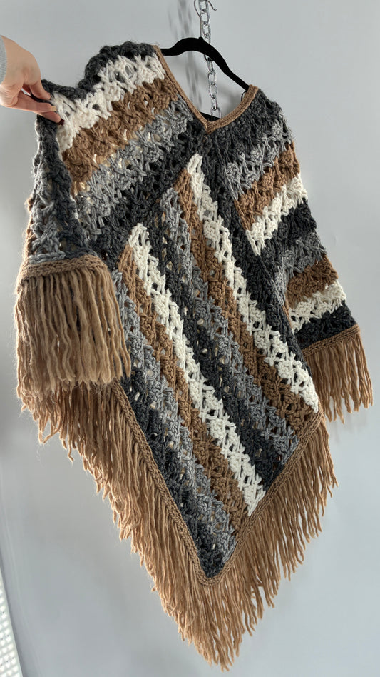 MASSIMO DUTTI Neutral Fringe-lined, Knit Poncho with Tags Attached (Small)