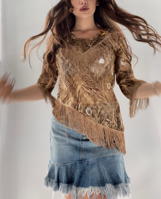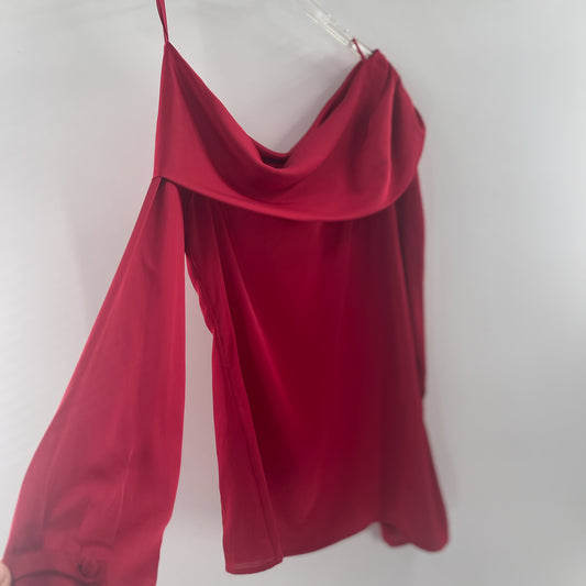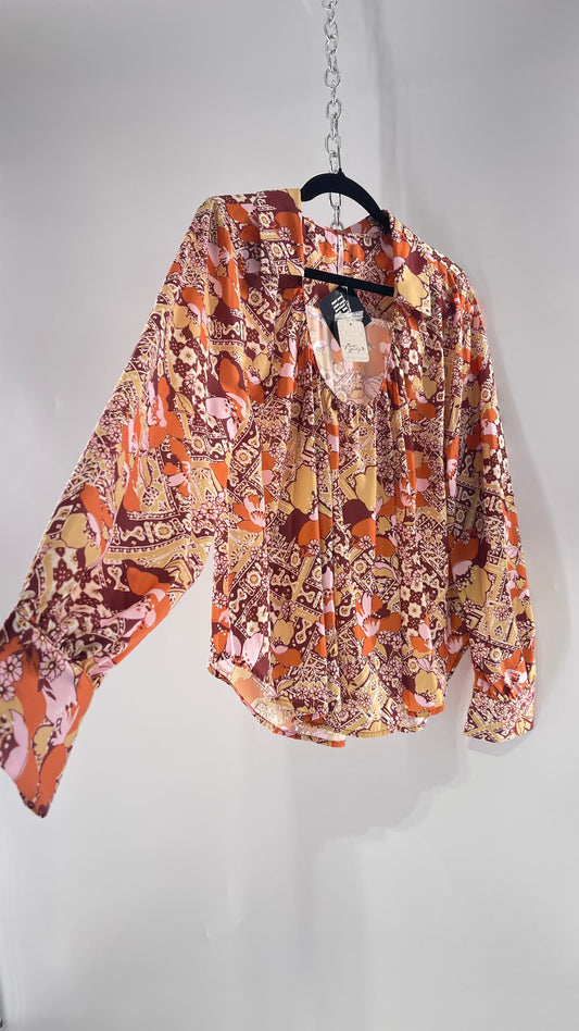 Free People All Over Mixed Warm Toned Satin Blouse with Pleated/Draping Neckline and Collar, Tags Attached (Small)