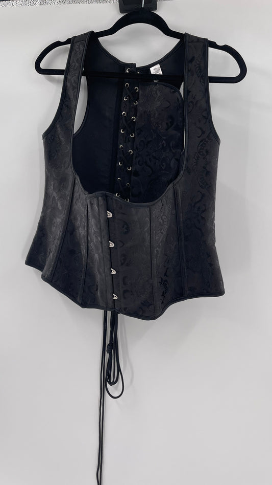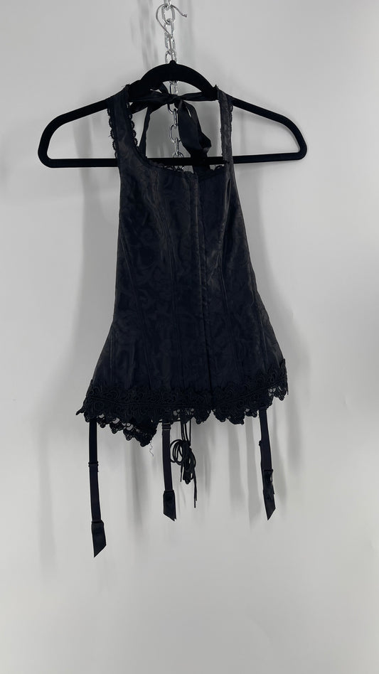 Vintage Fredericks of Hollywood Black Satin Brocade Lace Corset with Lace Tie Halter (32)