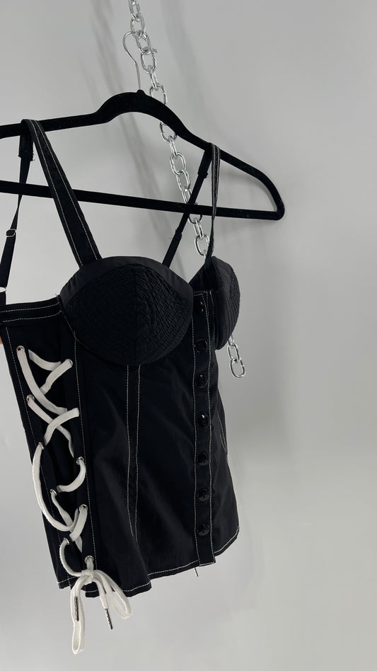 IAMGIA Black Corset Tank with White Lace Tie Up Detail and Contrast White Stitching (S)