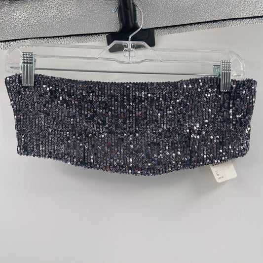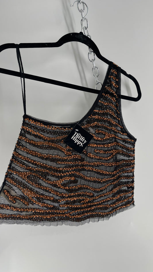 Free People Black Mesh One Shoulder Blouse with Copper Zebra Patterned Sequins (XS)