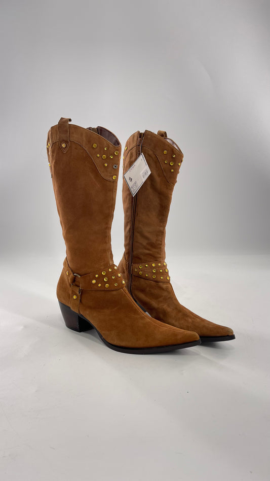 Vintage STEVEN Tan Suede Pointed Cowboy Boots with Yellow Crystal Embellishments (9.5)