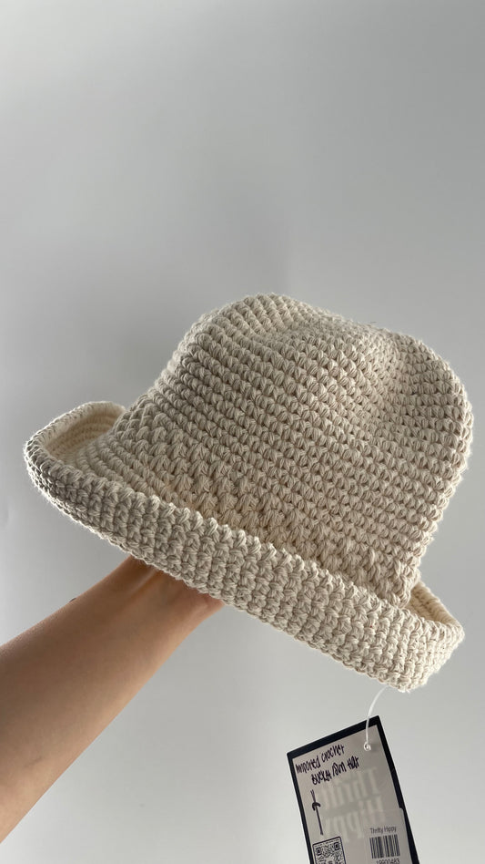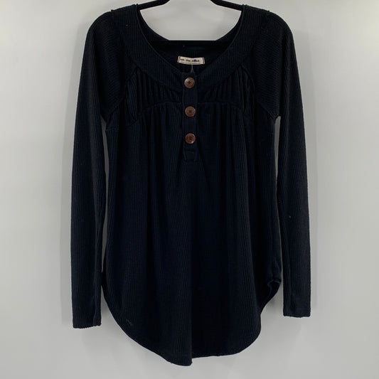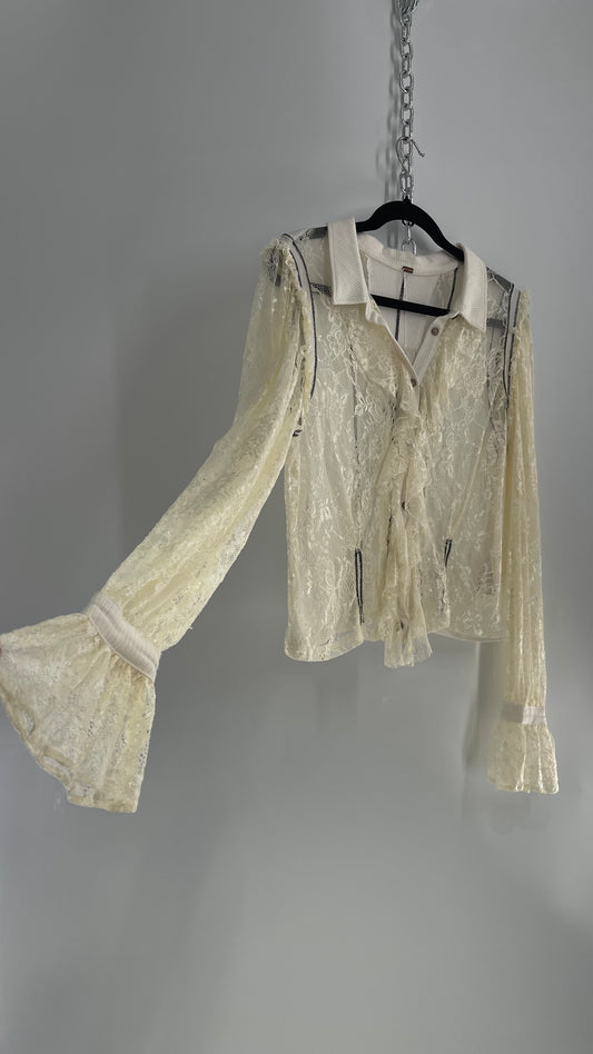Free People White Ribbed Knit Lace Button Front Blouse with Balloon Sleeves and Ruffle Front Detail (Small)