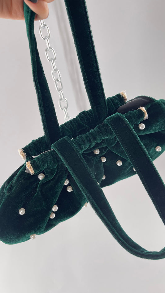 Vintage Deep Green Velvet Purse Covered in Pearls, and Featuring Gold Metal Closure Still Lined in Protective Plastic
