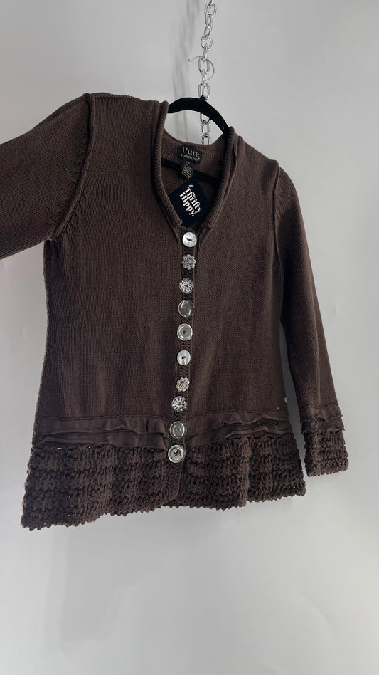 Vintage Pure Handknit Ruffle Hem Brown Cardigan with Button Front (S/M)