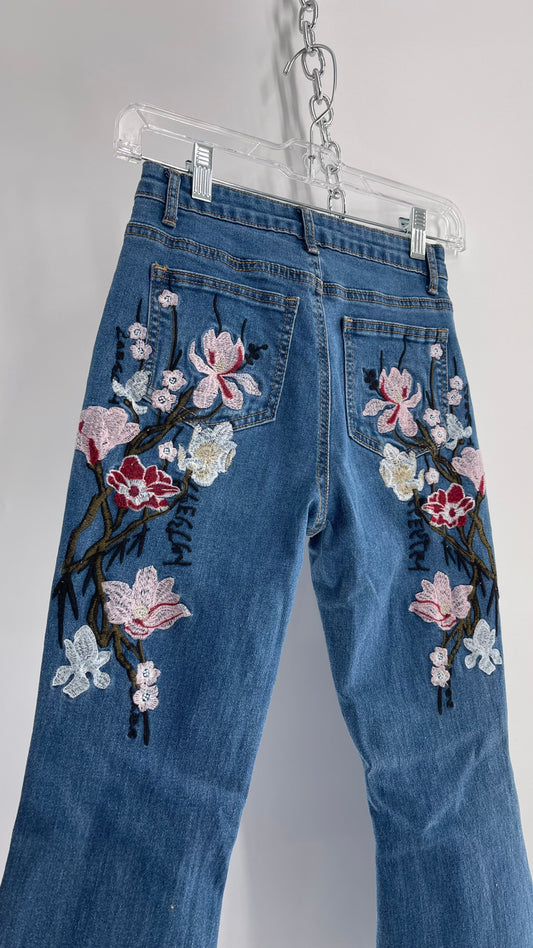 Medium Wash Denim Flares with Floral Embroidery (XS 0/2)