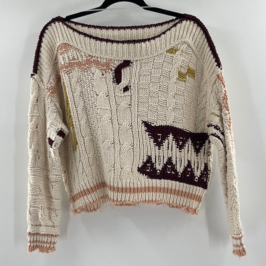 Free People Distressed Cropped Sweaters Cream With Burgandy Mustard and Pink Details (Size XS)
