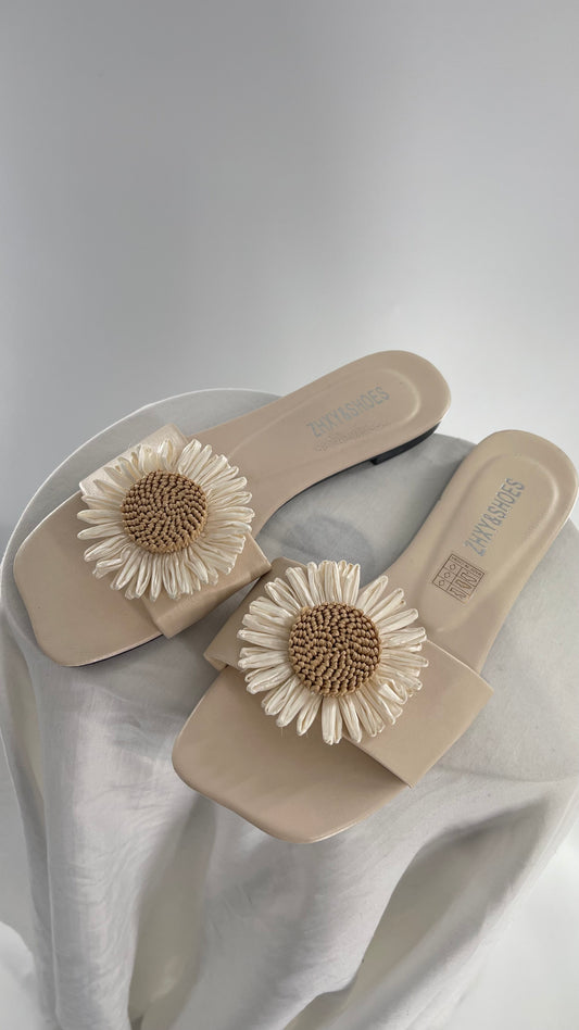 Neutral Beige Square Toe Flower Flats (39)