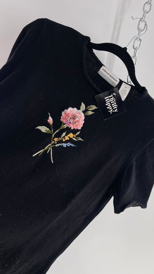 Vintage Alfred Dunner Black Embroidered Bouquet Top with Perforated Hem (Medium)