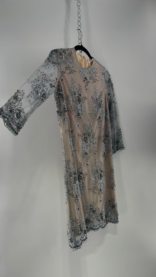Koravilas Anthropologie Grey Mesh Embroidered Lace Long Sleeve Beaded Dress (4)