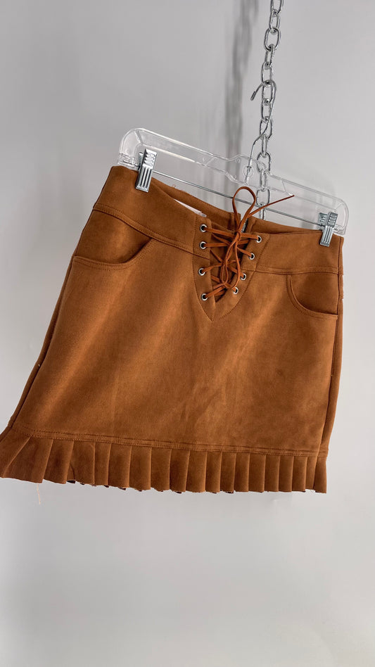 V Koovifa Vegan Suede, Tie Up Front, Pleated Hem Mini Skirt (Medium)