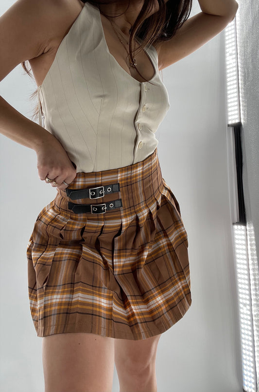 Vintage No Boundaries Buckle Side Tan Plaid Pleated Mini Skirt (M)7-9)
