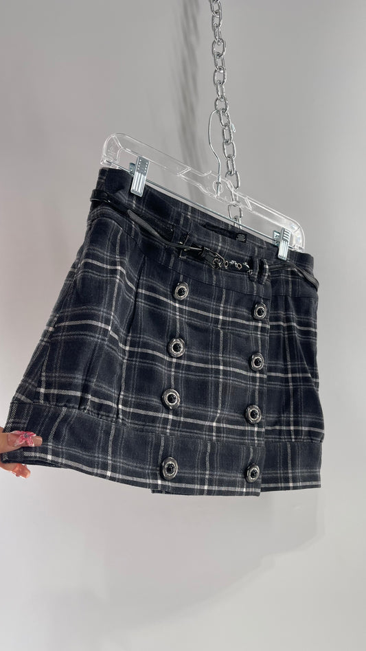 Vintage 2000s Gray Plaid Mini Skirt with Button Front and Belted Waistline (Medium)