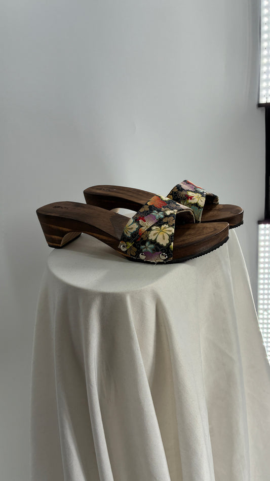 Vintage HUANG Wooden Sandal Clog with Floral Patterned Strap (8.5)
