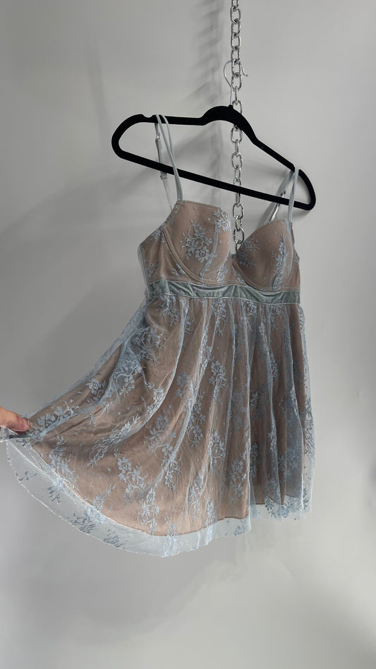 Vintage Tan and Baby Blue Lace Babydoll with Velvet Band
