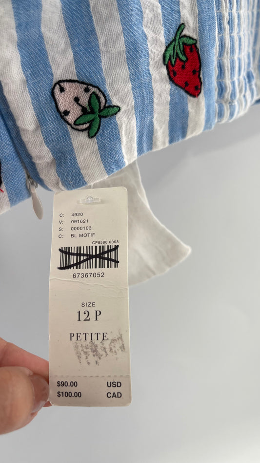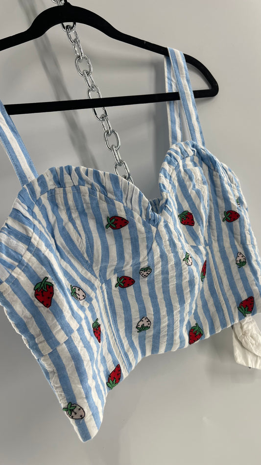 Maeve Anthropologie Baby Blue White Striped Corset Like Crop with Embroidered Strawberries with Tags Attached (12)