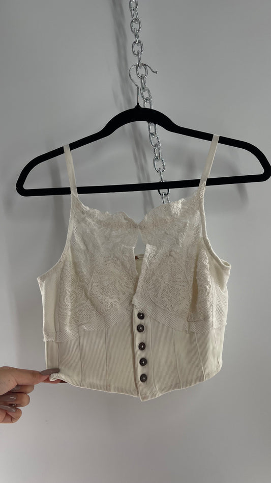 Free People White Tank with Lace Bust and High Neckline and Buttoned Bodice (S)