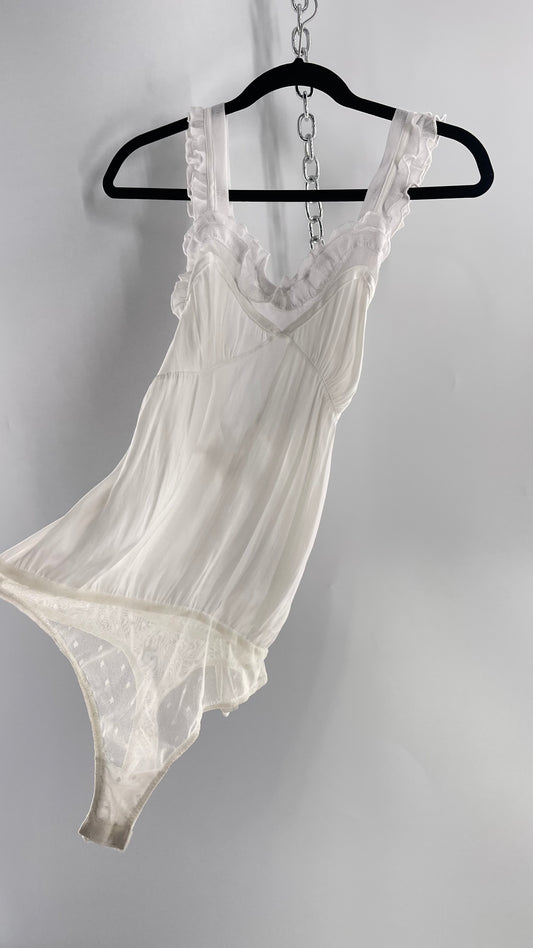 Free People White Silky Soft Bodysuit with Ruffled Bust-line and Straps (M)