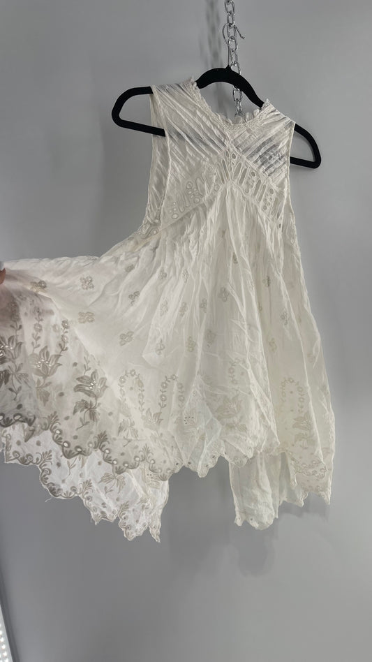 Free People White Cotton Eyelet Embroidered Lace Tank with Pleating, Buttoned and Slit Back (Small)