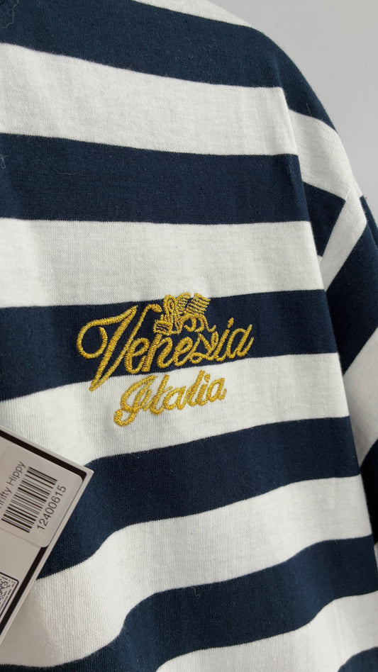 Vintage VENEZIA Striped Navy Short Sleeve with Gold Embroidery Designed in Italy (Large)