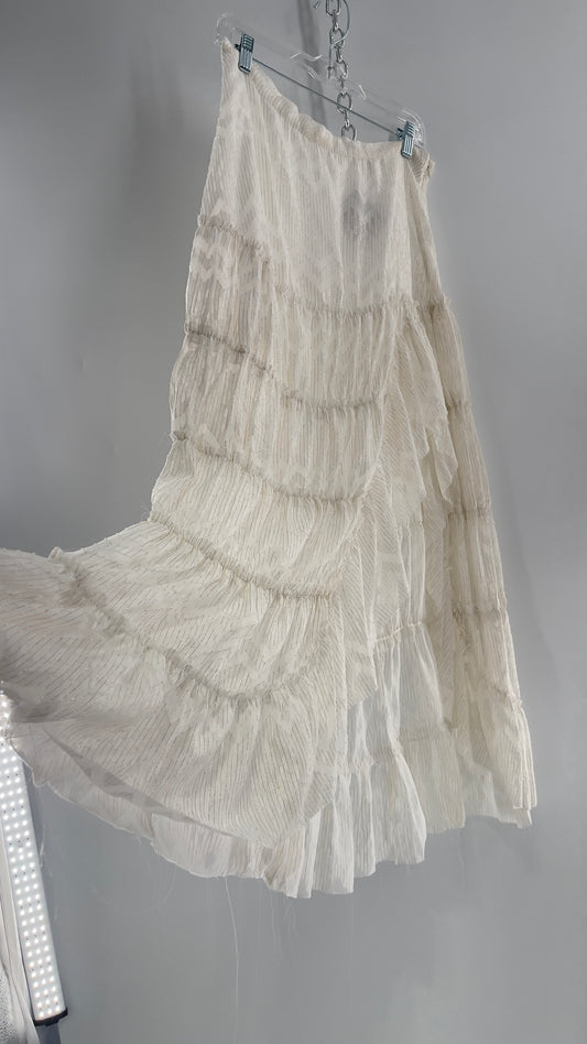 Free People Raw Edge Hem White Gold Tinsel Skirt with Ruffle Side Slit (Small)