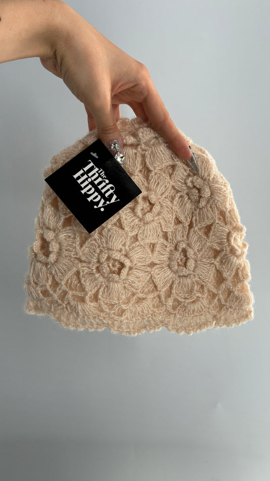 Vintage Deadstock Beige Beaded Fringe Purse with Embroidered Beaded Florals