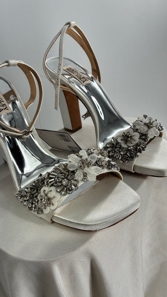 BADGLEY MISCHKA White Square Toe Embellished Florals Heels (9.5)