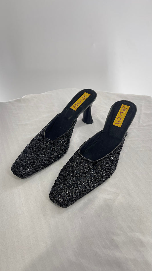 Vintage Black Beaded Angular Square Toed Kitten Heels (41?)