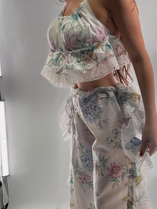 Handmade Vintage 2Piece Muted Pastels, Wispy Florals Ruffled Bum Set (XS-XL)