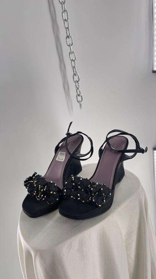 FIONI Vintage Black Wedge Satin Heel with Beaded Floral Rosette Petals (7.5)
