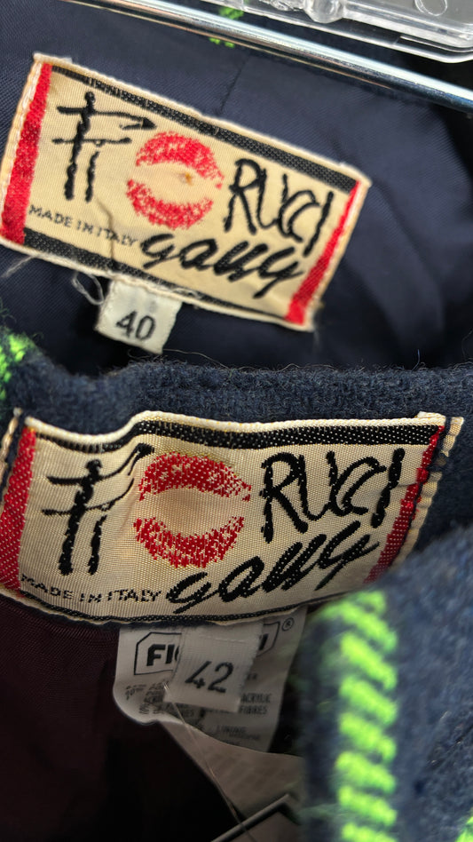 Vintage FIORUCCI GANG Navy and Neon Green Plaid Suit Set with Cropped Blazer and Mini Skirt (40,42)