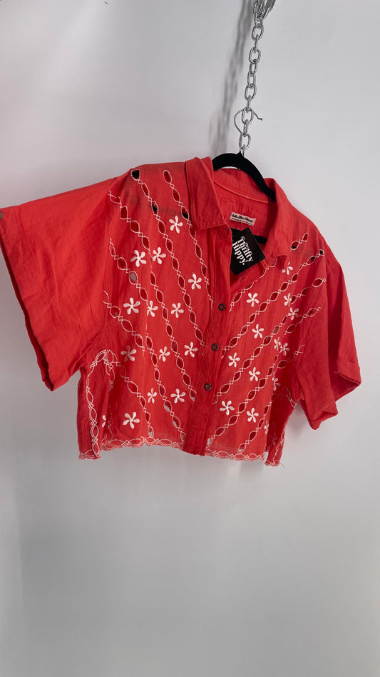Free People Coral Top with White Eyelet Lace Embroidery (XL)