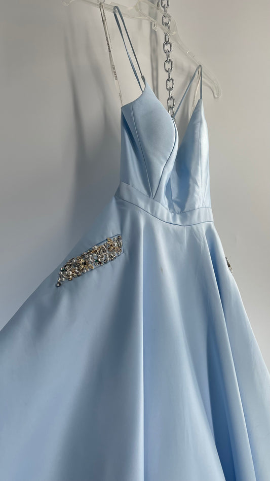 SHERRI HILL Baby Blue Worn Dress with Beaded Pocket Detail and Tie Up Back (4)