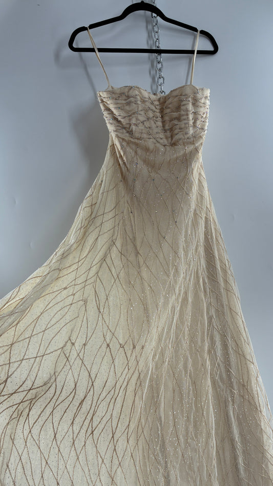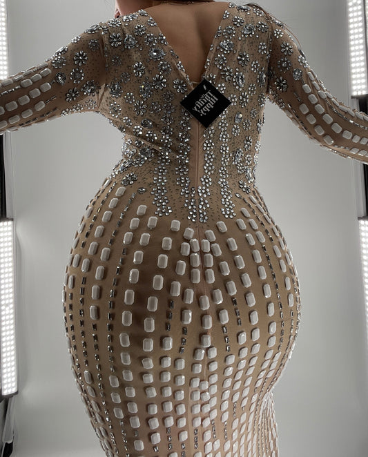 Modified Floor Length Gown Nude Underlay with Crystals and White Jewels (Medium)