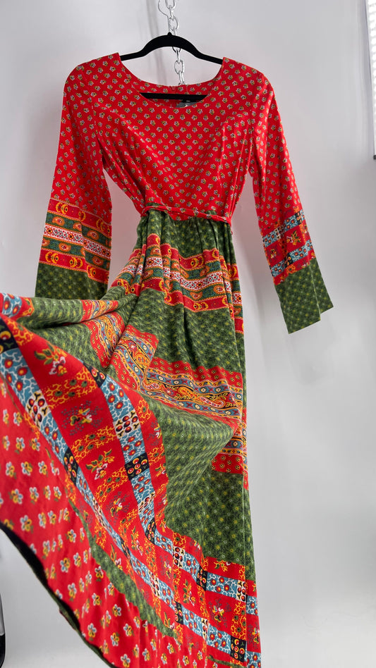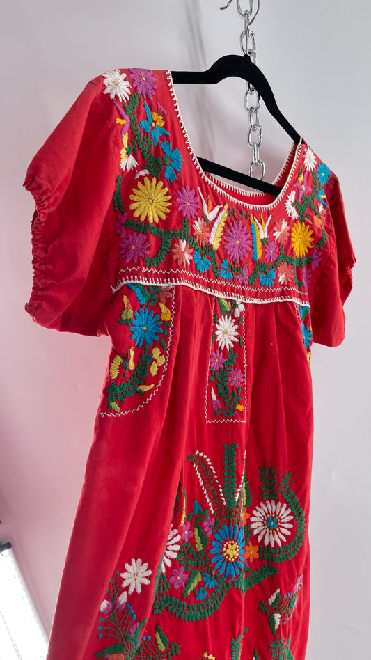Vintage 1970s Red Cotton Dress with Hand Embroidered Florals Imported from Mexico (Small)