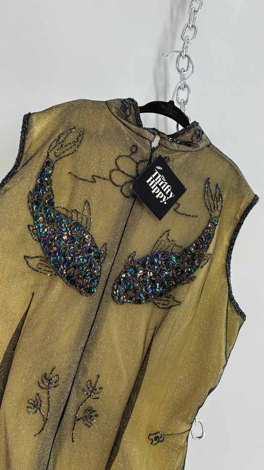 Vintage 1990s One of a Kind Handmade, Green Gown with Beaded Koi Fish, Metallic Tulle Overlay, and Symmetric Back (Medium)